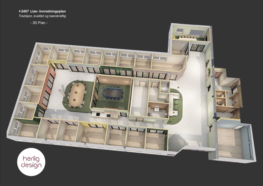 Oppgradering av administrasjonslokalene Her blir det flere kontorer,møterom, ny spisesone og nytt moderne toalettanlegg. Innbydende Lounge-sone som møter ansatte og kunder i hovedinngangen. Nytt ventilasjonsanlegg for godt inneklima.I innredingsplanen har vi jobbet med å fremheve Lians verdier som "tradisjon,kvalitetog bærekraft.